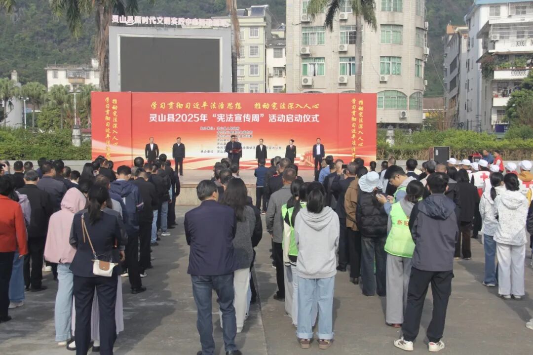 为迎接第十二个国家宪法日、第八个“宪法宣传周”,灵山县于12月4日上午在县人民广场隆重举行2025年“宪法宣传周”活动启动仪式暨“学习贯彻习近平法治思想,推动宪法深入人心”主题宣传活动。县委常委、政法委书记、县委依法治县办主任黄高钊,县委常委、宣传部部长胡华庆,副县长、县公安局局长朱勇,县法院院长李夏冰,县检察院检察长陆增权出席活动,各镇(街道)、县直各相关单位及律师事务所代表共计200余人参加仪式。