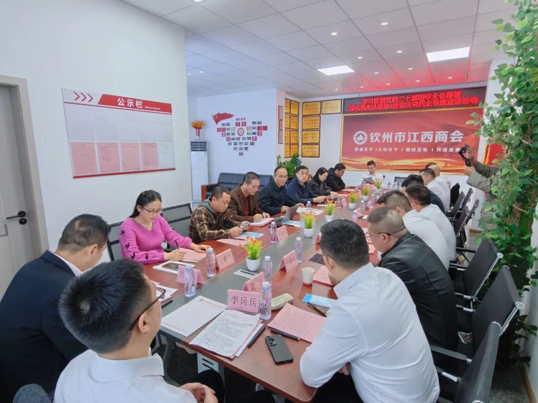 2025年12月5日上午9时30分,冬日的钦州虽微有寒意,但在钦州市江西商会的会议室内,却涌动着融融暖意与澎湃激情。一场由钦州市工商联与钦州市司法局联合主办、钦州市江西商会承办的“学习贯彻党的二十届四中全会精神暨弘扬宪法精神•建设法治民企”专题宣讲活动在这里温情启幕。钦州市委统战部副部长、市工商联党组书记谢江,会员企业科科长王文旭;钦州市司法局党组成员、政治部(警务部)主任柴淑忠,律师科科长王丹,广西环洋律师事务所主任黄辉等一行,带着政策的温度与法治的厚度走进商会。商会会长刘少春携商会领导班子成员,以家人般的热情,迎接了这场“精神盛宴”与“法治甘霖”。